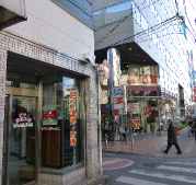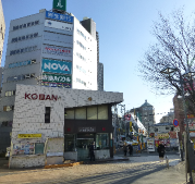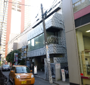白いレンガのビルが駒崎ビルです